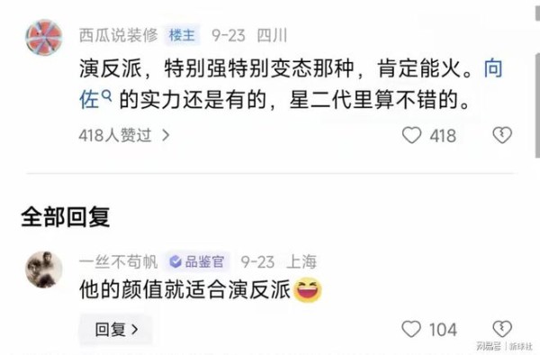 在《门前宝地》上映后,甚至还有网友留言,说向佐适合演反派,而且是那种“特别强特别变态的反派”,网友认为向佐如果出演那种反派,“越是变态”的就越能火!