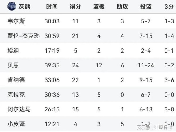 【下半场】肯纳德连中三分灰熊取得10:2开局,杰伦格林范弗里特连续命中远投紧咬分差,三节战罢火箭96:92灰熊,末节开局火箭依靠篮板优势取得领先,不过3J连得7分紧咬比分,关键时刻再次制造狄龙犯规完成反超,随着范弗里特三分不中火箭惜败灰熊1分