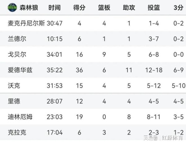 主场作战的爵士开场进攻端火力全开,赛克斯顿与马尔卡宁一内一外打的森林狼措手不及,单节领先4分,次节开始爵士进攻开始哑火,森林狼外线手感火热,里德与加尔扎内线优势巨大,半场反超4分,第三节爱德华兹开始收割比赛,单节独得16分一举将分差拉开至26分,末节成为练兵阶段,最终森林狼取得大胜
