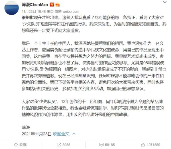 真的替她脸红,如果没有这个事件,陈漫估计也不会认识到自己行为的恶劣吧。不仅是陈漫,国内现在还有多少所谓的艺术家,都在以迎合西方审美为目标,不停在做恶心国人的事情,如之前的清华美院时装秀事件。