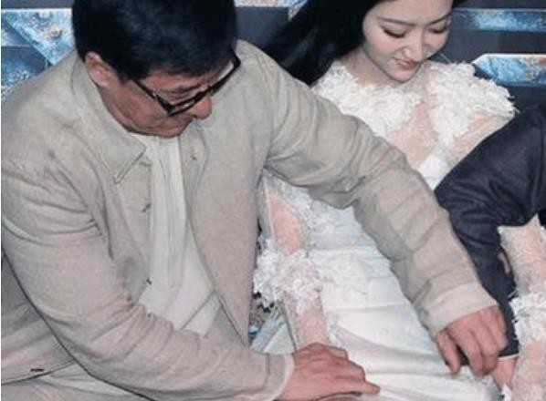 图中是成龙为景甜遮盖裙子,看成龙的双手就知道了他的想法了。