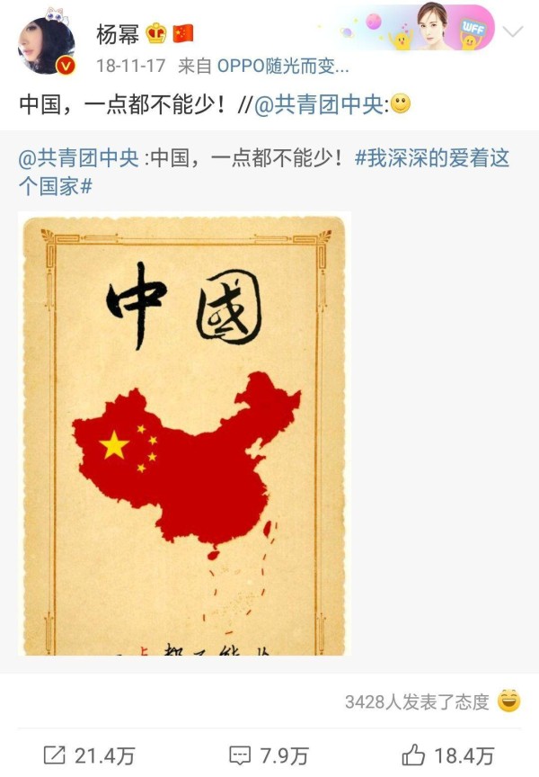 杨幂作为该奢侈品品牌的代言人,半夜两点半上线删除相关微博,不观望不含糊没有模棱两可,直接发声明解约,出事后第一时间两小时之内解决,摆明立场和态度。相当刚。多少人挤破头求之不得的香饽饽,在国家主权面前都显得如此弱小。不得不说,杨幂这一次赚足了路人的好感度。杨幂的时尚界的事业,这些高奢,顶奢代言都是她自己一步一步资源置换打下来的江山,真没啥后台可言。出了事她说不要就不要的明确态度很飒。