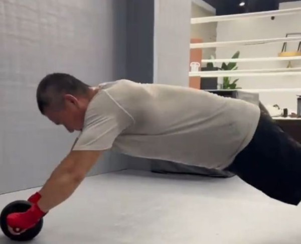 在照片中,可以看到67岁的张丰毅正站在健身房的训练区域,身穿简约的运动服,手持着专门用来锻炼腹肌的腹肌轮。