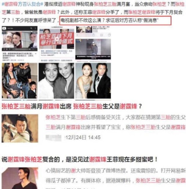 近日因为张柏芝生下第三个儿子,这几人再次被推上了风口浪尖,先是张柏芝三子的父亲,被大众各种猜测,再到媒体造谣说三子父亲仍是谢霆锋,还说谢霆锋再次甩掉王菲,与张柏芝重归就好,一句又一句不实言论,在网上不断地发酵。