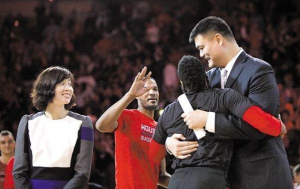 姚明头号粉丝哈登,见到姚明直接熊抱,叶莉露出迷人微笑