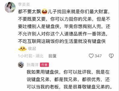 在对网友的批评作出回应时,孙海洋迅速表达了自己的立场,强调自己并非键盘侠,而是键盘兄弟,并表示对键盘兄弟依然怀有很大的尊重。