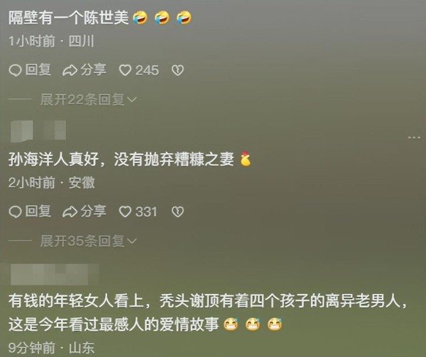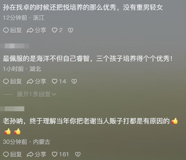 更耐人寻味的是,有网友翻出当年孙海洋误把谢爸当人贩子的旧事,现在反而成了佐证孙海洋"慧眼如炬"的证据。