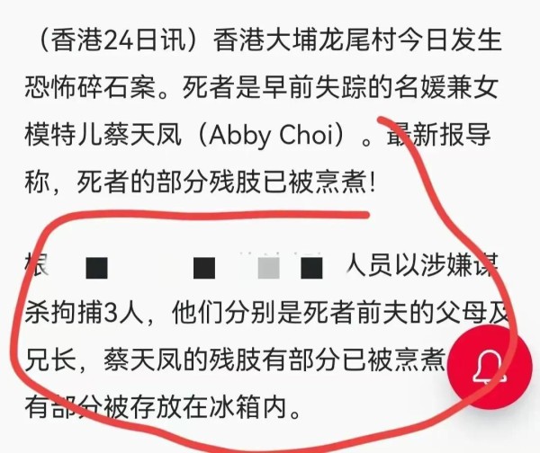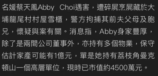 2月24日,港媒报道称,28岁的香港名媛蔡天凤碎尸身亡