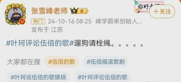 这时候,考研名师张雪峰直接在自己的微博大号上骂叶珂,还专门加上相关的话题标签,直接点名道姓地骂。哇哦,这可真够猛的!张雪峰老师向来是有啥说啥。他这一骂,网友们都纷纷点赞。大家都觉得张雪峰老师做得对,叶珂不该喷伍佰老师。