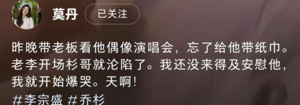 近日,乔杉在观看偶像李宗盛的演唱会时,开场不久便情感失控,陷入深深的感动之中。