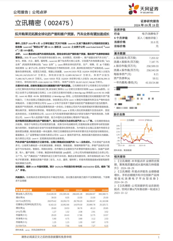 此外,立讯和莱尼有良好的资源匹配度和业务协同性,股权交割后能实现互相赋能。例如:莱尼的主力产品为线束组装,立讯在线束产品上拥有扎实的制程优化能力和成本管控经验,我们的合作使得这种深度协同的采购、自动化、成本管控等优势能够在更大平台上发挥效益;立讯的汽车线束业务在连接器/数据线/特种线束方面拥有垂直一体化整合能力,能帮助莱尼提升在线束组装业务的竞争力,更好的去服务海内外全球主流车厂,莱尼现有的线束业务基础和未来的成长也为立讯的连接器、汽车电子、智能驾舱/自动驾驶等零部件产品提供了更大更广的出海口;并且,莱尼在全球多个地区拥有丰富的产能配置,立讯积累的中国车厂客户资源可以帮助莱尼实现更多元化的客户结构优化,提高其全球的产能利用率,同时立讯也借助莱尼的海外客户渠道,以及制造/研发/销售布局的基础,大大节约海外业务拓展、产能建设的成本与时间,并进一步丰富在线束组装方面的研发资源配置。