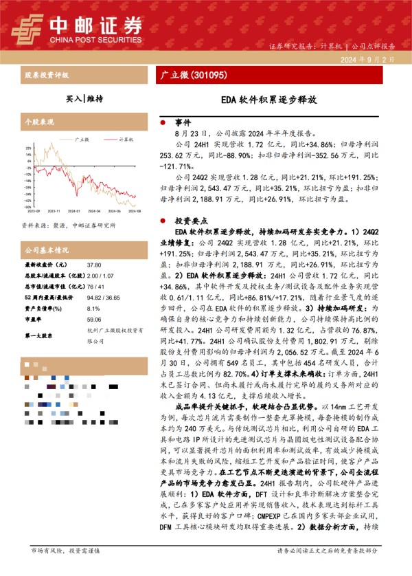 2024年上半年公司实现营业收入17,177.59万元,同比增长34.86%,主要系软件开发及授权业务快速增长所致,其同比增长86.81%;2024年上半年公司剔除股份支付影响的归属于上市公司股东的净利润为2,056.52万元,盈利情况逐季度改善。上半年公司研发投入13,204.08万元,同比增长41.77%,主要系公司产品线丰富,研发团队逐渐扩大。