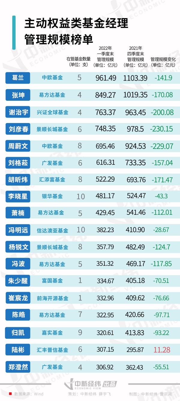 除此以外,截至2022年一季度末,谢治宇的管理规模降至763.37亿元,较上季度末下降200.08亿元;中欧基金周蔚文的管理规模降至695.46亿元,较上季度末下降229.07亿元;刘格菘的管理规模降至616.31亿元,较上季度末下降157.04亿元;汇添富胡昕炜的管理规模降至522.29亿元,较上季度末下降171.47亿元。
