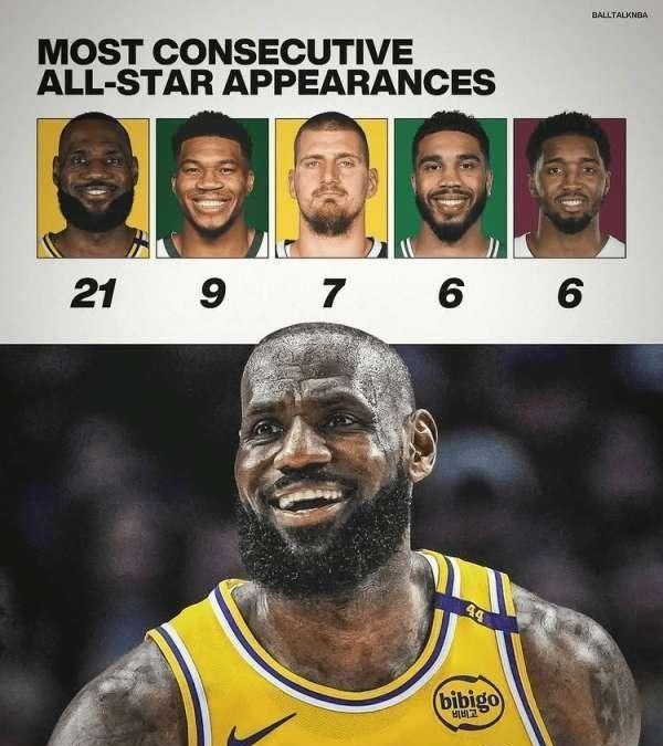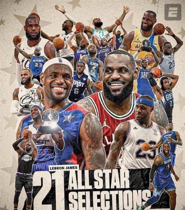 詹姆斯连续21年入选全明星,传奇依旧令人敬佩