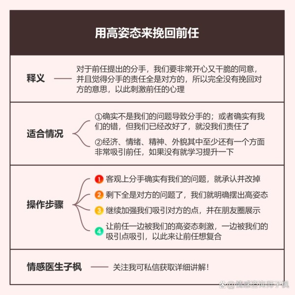 那这个情况明显更适合高姿态路线挽回,高姿态的起点就是,跟对方谈到为什么会分手的时候,一定不能太柔和,要像我们忍受了对方很久以后,情绪集中爆发出来一样,把对方客观存在的所有问题,全部捅破,对方敢反驳,就义正言辞地怼回去,对方继续耍赖不承认,就直接大骂对方一顿。