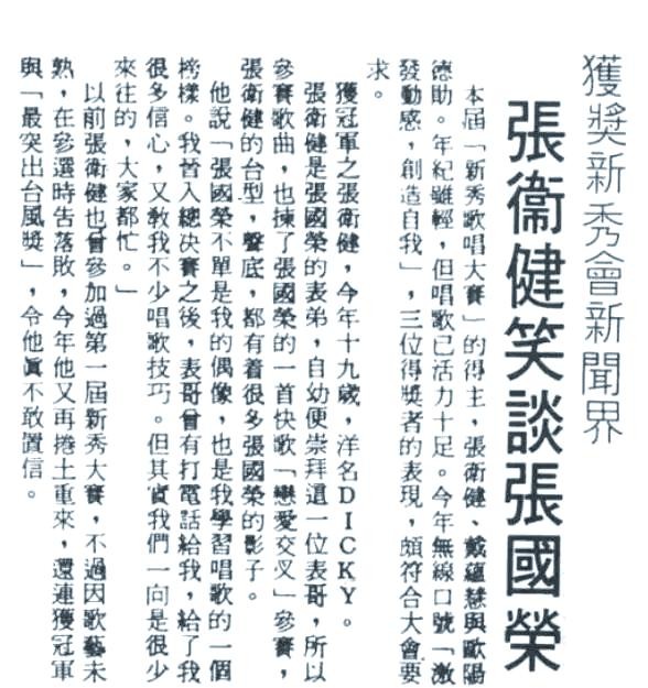 在张国荣的表弟张卫健荣获新秀歌唱比赛冠军和突出台风奖的第三天,我曾与张国荣通过电话。当聊到他的这位表弟时,我回想起曾在张国荣家中见过他。那时,我们正在拍摄张国荣的新居,张卫健也在场。 在与张国荣的通话中,媒体人也探讨了张卫健与张国荣的关系与事业,揭开了他们友谊的更多细节。 张国荣解释说,虽然当时对外宣称是表弟,但事实上并非如此。他透露,一年多前,他在几家餐厅演唱时认识了张卫健。为了帮助张卫健并希望因此获得更多演唱机会,他开始对外介绍张卫健是他的表弟,以期获得更多人的帮助。
