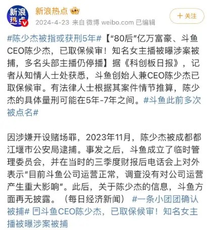 此后,斗鱼CEO陈少杰因为涉嫌开设赌场罪被逮捕,不少斗鱼头部主播暂停直播。
