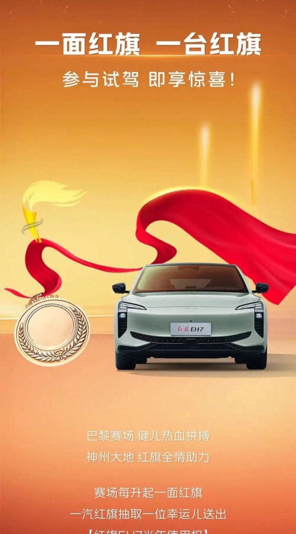 在这场战役中,红旗品牌以其独特的爱国情怀和前瞻性的营销策略脱颖而出。从“一面红旗,一台红旗”的响亮口号,到“奥运赛场上每升起一面五星红旗,就向奥运健儿赠送红旗EH7荣耀版轿车一辆”的豪迈承诺,红旗不仅展现了其作为民族品牌的担当与自信,更用实际行动诠释了“国车”的荣耀与辉煌。