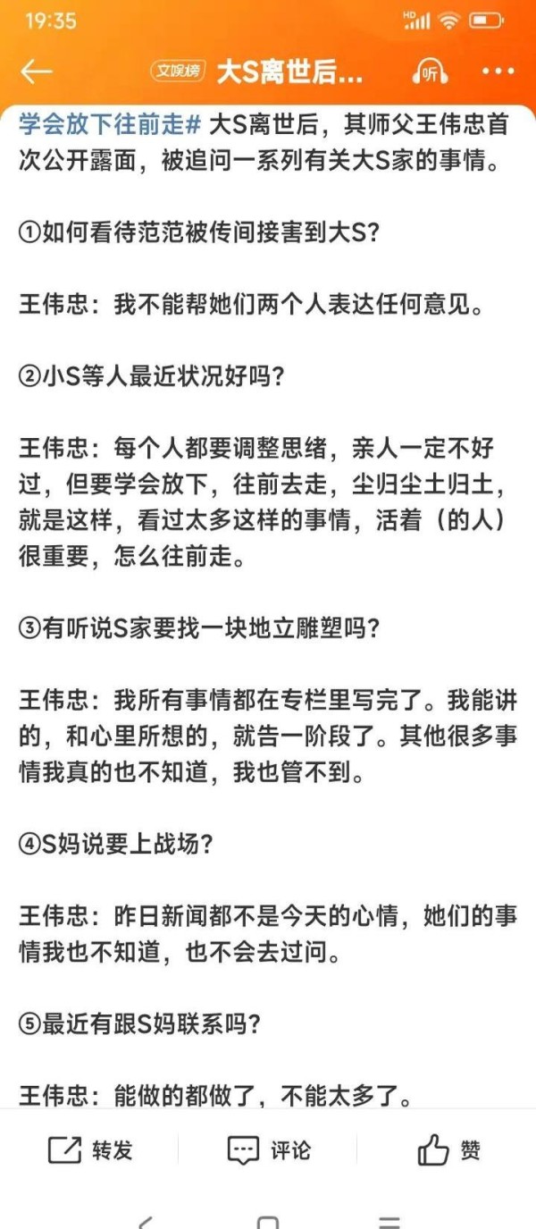 在大S离世后首次面对媒体的王伟忠,发言里明显带着划清界限的意味。