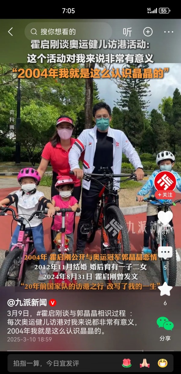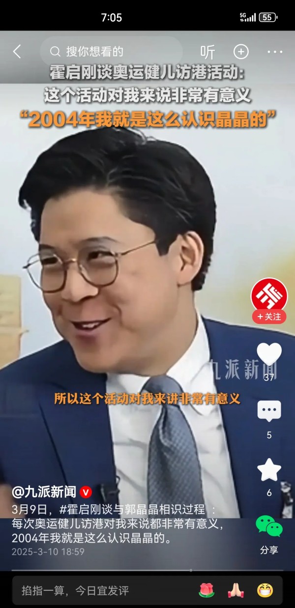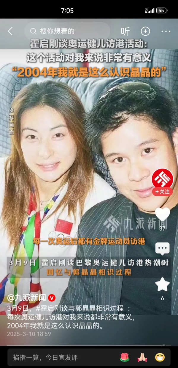 刚才刷头条看到有一个热搜,是讲霍启刚和郭晶晶认识的过程,他讲奥运结束之后奥运冠军都会防港,霍启刚讲这个活动对他是非常有意义的,就是在这种场合认识的郭晶晶。