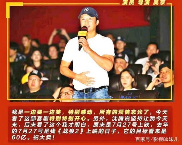 吴京更是直言是一部好作品影片,能驱除所有烦恼,特别感动。并说终于知道为啥沈腾执意要我今天来,原来是定档日期跟我《战狼2》是同一天7月27日上映,看来它的目标是60亿,并预祝大卖!