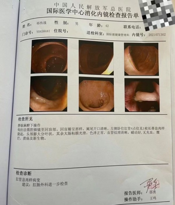 紧接着,祁隆晒出自己去年住院的检查报告单和视频,检查报告上诊断他为“肛管息肉样病变”。