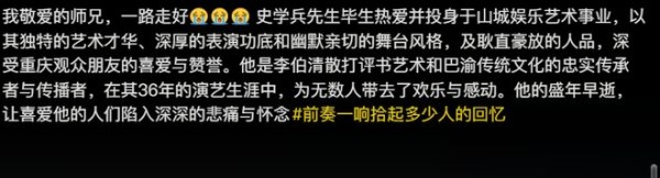 史学兵去世后,其师弟发文缅怀,透露他从18岁开始表演,至今已有36年的演艺生涯。他的艺术才华十分出众,且有很深厚的表演功底,舞台风格也幽默亲切。加上性格耿直豪放,深受重庆观众的喜爱。