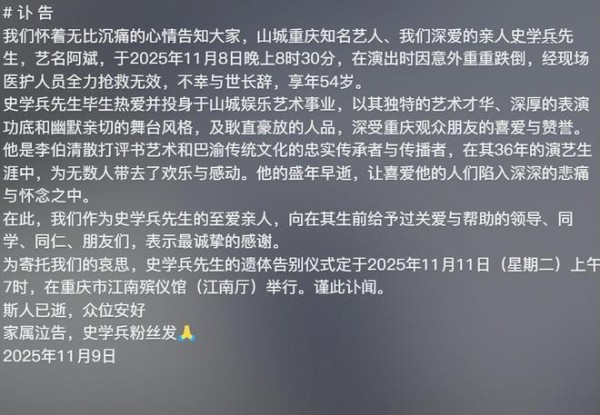 11月9日,多位网友发帖爆料重庆山城知名艺人史学兵去世的消息,令人十分意外。
