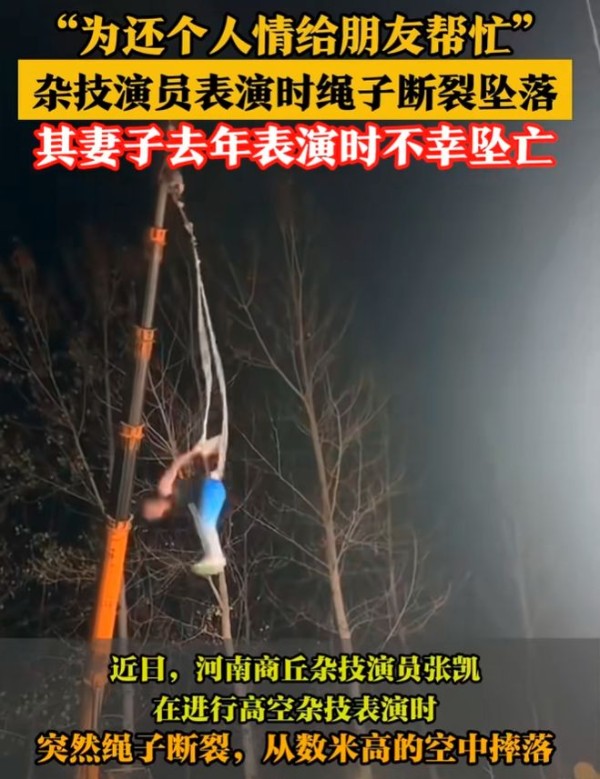 去年媒体便报道,河南商丘杂技演员张凯,在进行高空杂技表演时绳子忽然坠落,伤得很重。而且他的妻子去年在表演时也不幸坠亡。