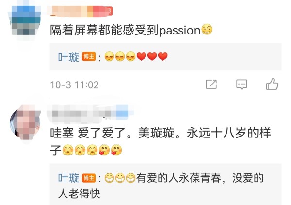 很多网友看到叶璇晒出的照片后留言道“隔着屏幕都能感受到热情”,还有网友夸赞她永远是18岁的样子,叶璇也心情很好的回复网友的评论称“有爱的人永葆青春,没爱的人老的快”。