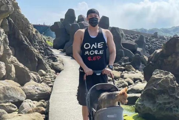 另外,他手里推着一辆婴儿车,里面有一只小狗,看得出来何润东对这只狗狗非常宠爱,外出都舍不得让它走路。