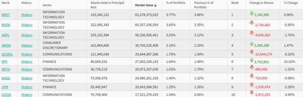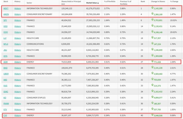 在前五大重仓股中,微软(MSFT.US)位列第一,持仓1.20亿股,持仓市值约622.8亿美元,占投资组合比例为3.77%,较上季度持仓数量增加0.96%。