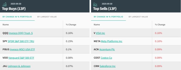 从持仓比例变化来看,前五大买入标的为:景顺纳指100ETF(QQQ.US)、SPDR标普500指数ETF(SPY.US)、景顺MSCI美国ETF(PBUS.US)、Vanguard标普500指数ETF(VOO.US)、强生(JNJ.US)。