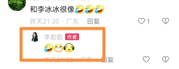 有人留言称李勤勤神似另外一名女演员李冰冰,李勤勤还留言互动,用三个表情符号回复,看得出她还是比较认同撞脸李冰冰。