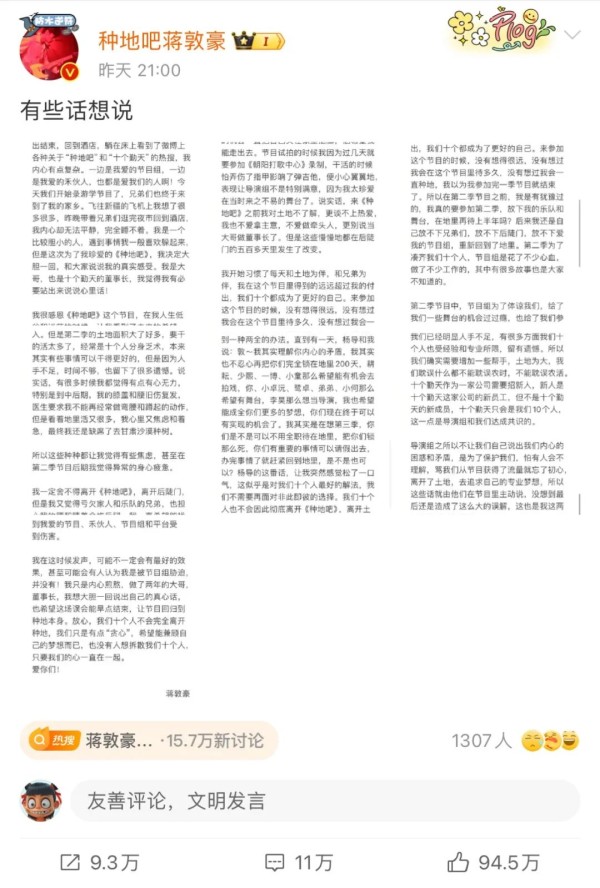 粉丝显然对这个解释不买账,迅速发长文反击,标题直接写道:“十个勤天缺一不可,节目组不可卸磨杀驴,推卸责任”。与此同时,《种地吧》掉粉70万、80万、90万的消息接连冲上热搜。眼看事件影响愈演愈烈,十个勤天的大哥“蒋敦豪”结束鸟巢演唱会后,迅速在7月22日带头回应,其他成员纷纷在评论区留言支持。
