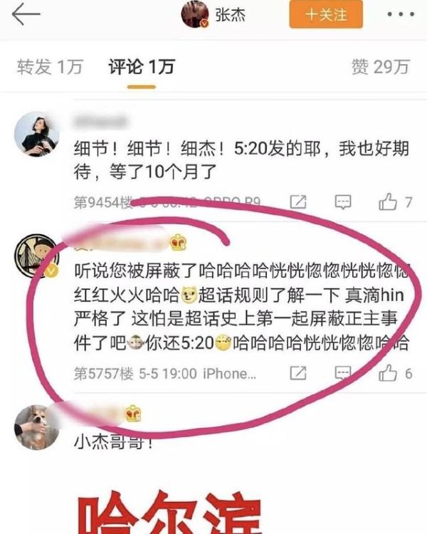 只想说,粉丝屏蔽正主?这件事情好像还是第一次见吧?真的是太恐怖的粉丝了啊,而且还有很多粉丝幸灾乐祸的在张杰的微博底下说听说你今天被屏蔽了?所以,粉丝都觉得自己很骄傲是嘛?作为一个外人,只会觉得拥有这样的粉丝,张杰也是挺倒霉的,还不能够在自己的粉丝中发关于自己的妻子的微博,这也是有点无语了。