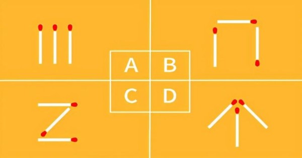 【问题】 现在在你手里有三根火柴,如果要你把它们摆在桌子上,你会摆出怎样的形状呢?请从A~D中,凭直觉选择1个。