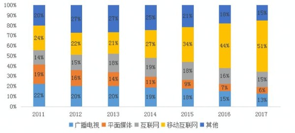 图1:2011年-2017年五种媒体的市场份额变化(数据来源:2018年中国传媒产业发展报告)