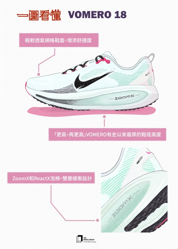 談到 NIKE 跑鞋的 VOMERO 系列,眾多跑者都會對其的超強緩震功能感到印象深刻,在今年的 VOMERO 18 、 VOMERO PLUS 和 VOMERO PREMIUM 更是強化這項特性。「更高、再更高」, NIKE 研發團隊此次突破性的一項嘗試,就是讓 VOMERO 18 的鞋底擁有 46 毫米的堆疊高度,比前一代 VOMERO 17 增加了 6 毫米,冀求助力每一位跑者跑出新高度的成績。