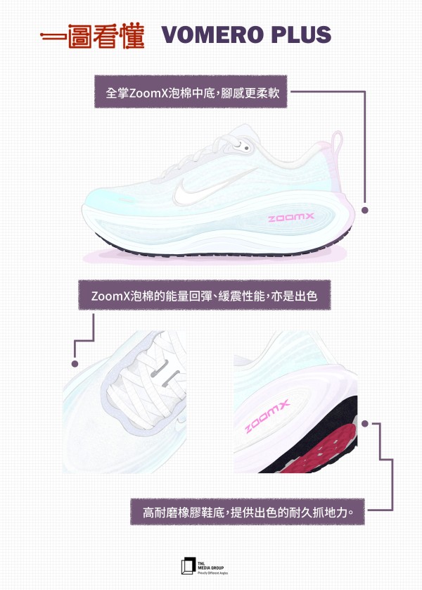 對於第一次見到 VOMERO PLUS 的人,都會被它精心設計的流暢外觀線條所吸引。選擇使用全掌 ZoomX 做為泡棉中底,比 VOMERO 18 更柔軟、輕盈且更具敏捷性。給予跑者最佳緩衝力的 VOMERO PLUS,不論是從事有氧慢跑或長距離慢跑,都可以感受到 ZoomX 泡棉令人驚豔的能量回彈與出色緩震性能。再結合精製網眼鞋面,無論男女都可以穿得輕便又舒適。
