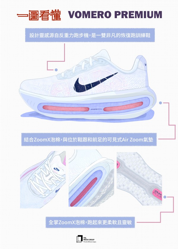 自推出以來就備受菁英運動員們所信賴的 VOMERO PREMIUM ,則是結合 ZoomX 泡棉,與設計於前足和鞋跟的可見式 Air Zoom 氣墊,才能實現極致出色的緩震功效。許多馬拉松選手在準備比賽時,會選擇交替運用碳板跑鞋和柔軟訓練鞋,而當他們擁有了 VOMERO PREMIUM 這款「超強訓練鞋」,同時提供在恢復跑和輕鬆跑時所需的出色緩震機能。源自專業「反重力跑步機」的設計靈感,只要一雙鞋,就能賦予跑者們在訓練時毫不受限的自在感受。