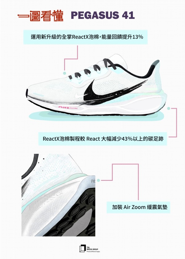 會選擇穿上 NIKE PEGASUS 系列的跑者,相信都是獨鍾於它所提供更加有感的「回彈緩震」能量回饋特性。過往感受過 NIKE 獨家研發 React 泡棉回饋能量的人,今年更應該要換上這雙 PEGASUS 41 ,體驗一下新升級 ReactX 泡棉提升了 13% 的能量反饋感。除了更厚的中底泡棉, PEGASUS 41 還在前足和鞋跟處配置了 Air Zoom 氣墊,加強其柔軟緩震之功效,無論是平日的有氧慢跑或節奏配速跑 ,讓每一步都能更為強勁且舒適。