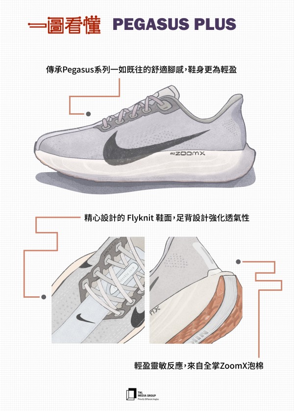 對於 NIKE 跑鞋的資深愛用者來說,看到 PEGASUS PLUS 就會聯想到 2018 年那帥氣的 PEGASUS TURBO ,但其實從裡到外,這雙跑鞋已從經典中蛻變出了新生。鞋舌與鞋面一體化的造型,全鞋採用精準設計的 Flyknit 織面,提供十分輕盈的腳感。另一項輕量又靈敏的性能,則是來自全掌式的 ZoomX 泡棉,同時加強中足支撐力、提升包覆性。整雙鞋的重量更是只有約245公克,加上相當舒適的回彈感受,跑出的每一步都有讓你難忘的輕彈腳感。