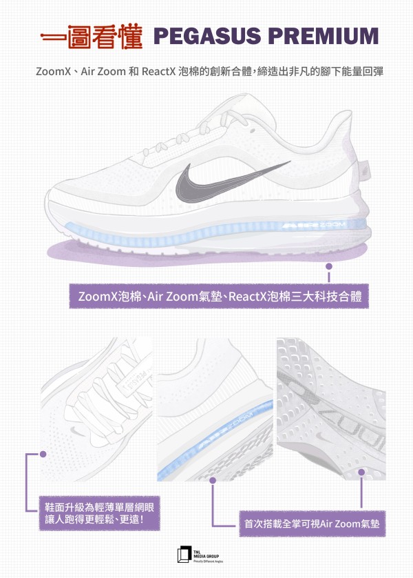 頂級的 PEGASUS PREMIUM ,則是 NIKE 跑鞋之三項強大技術: ZoomX 、 Air Zoom 和 ReactX 泡棉的創新合體,締造出非凡的腳下能量回彈。這雙首款運用全掌可視 Air Zoom 氣墊的跑鞋,舒適地貼合著你的腳掌線條,每一個邁步都能提供強大的 Air 能量。有了三大科技加持,穿著 PEGASUS PREMIUM 更能拋掉「想太多」的顧慮,讓 ZoomX 和 ReactX 泡棉所建構的緩震系統,在跑步過程中持續帶來平穩的腳感,同時讓能量回彈帶來充足的推進感;加上升級的輕薄單層網眼鞋面,舒適腳感讓你跑得更是輕鬆。