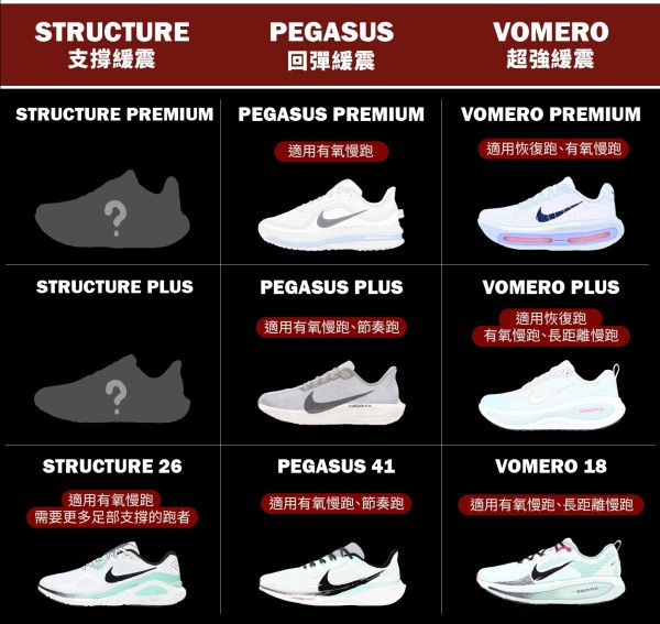 「 Just Do It 」, NIKE 不但要鼓勵你別被「想太多」綁住了你的雙腳,更會提早一步地為想要嘗試跑步,或熱愛持續奔跑的你而著想,不斷研發出「讓你跑得安心、減少運動衝擊」的多款跑鞋供你選擇。今年, NIKE 陸續推出的 VOMERO 系列、 PEGASUS 系列、STRUCTURE系列跑鞋,皆是為了不同類型跑者們的需求而誕生。