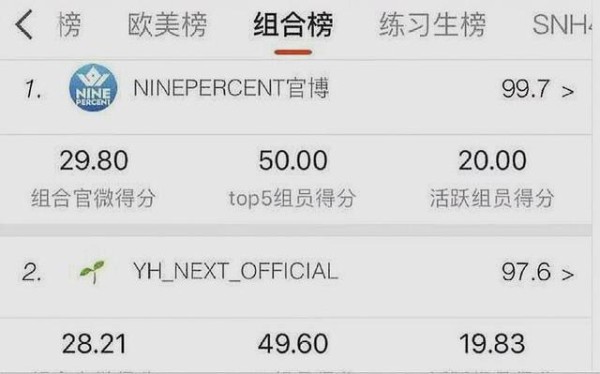 这就是近期的组合排行榜的前几位,这个排名很多人觉得不可思议,但是这只是暂时的排名,大家不要有太多的顾虑,想必大家都知道,这个排名都是暂时的,榜单的排名是实时更新的,所以呢还是要靠实力说话的。