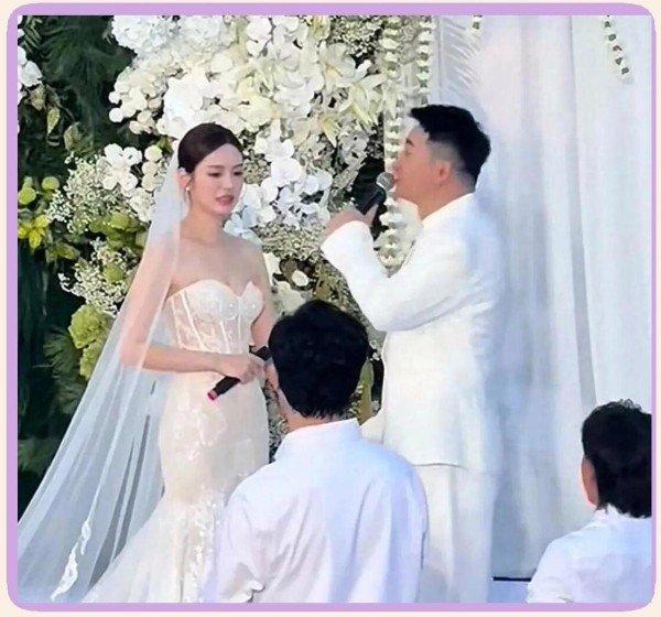 新娘孙浩然身着一字肩鱼尾白纱,惊艳亮相。在阳光的照耀下,纱裙上手工缝制的碎钻闪耀着细碎的光芒,与及腰的薄纱头纱相映成趣。这一画面让人感受到婚礼上,黄勇与新娘的互动充满了默契与温情。当黄勇整理西装领口时,孙浩然轻巧地帮他拂去肩上的碎草,而当黄勇单膝跪地时不慎绊倒时,孙浩然则以笑容和伸手相扶的动作,捕捉了现场摄影师的镜头。