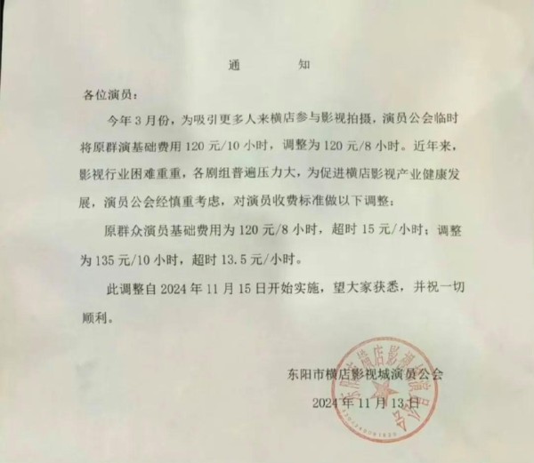 据蓝鲸新闻报道,近日,网传图片称横店影视城群演降薪。该图片显示:“原群众演员基础费用为120元/8小时,超时 15元/小时,调整为135元/10小时,超时13.5元/小时。此调整自2024年11月15日开始实施。”