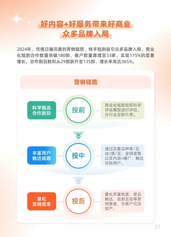 同时,快手星芒短剧不断探索商业化短剧新玩法,日益成为品牌营销的主流战场——2024年快手星芒短剧吸引众多品牌入局,商业化短剧合作数量突破180部,客户数量实现175%的显著增长,合作剧目数增长率达365%,快手品牌短剧合作复购率达38%,数据证明其不仅是“品牌爱投”的营销富矿,更是“品牌抢投”的绝对蓝海。