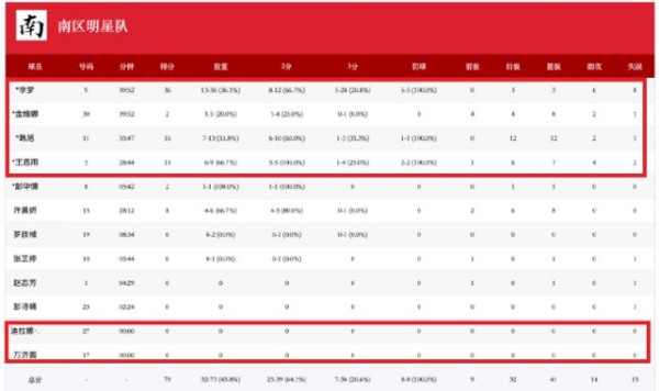 李梦全场36分,韩旭得到16分12篮板,外加王思雨得到15分,如此三叉戟合计得到67分。反观南区明星队其余球员合计仅得到12分,毕竟她们几乎没有多少登场时间,彭诗晴只打2分钟,赵志芳4分钟,张芷婷5分钟,罗欣棫8分钟,就算是位列首发的彭华倩也只打5分钟时间。至于北区明星队也有不少球员,在场上基本也是只有零星几分钟的登场时间。